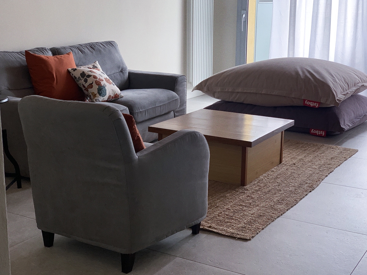 Nuevo apartamento en edificio con piscina (abierto desde el 01/06). Apartamento tipo estudio en la planta baja con baño con ducha y lavadora, sala de estar y cocina bien equipada (horno, microondas, hervidor y cafetera). En el apartamento también puedes encontrar un televisor de 32 pulgadas. El aire acondicionado cuesta 5 euros por día. Calefacción por suelo radiante del 15/10 al 15/04. Costo de 10 euros por día.