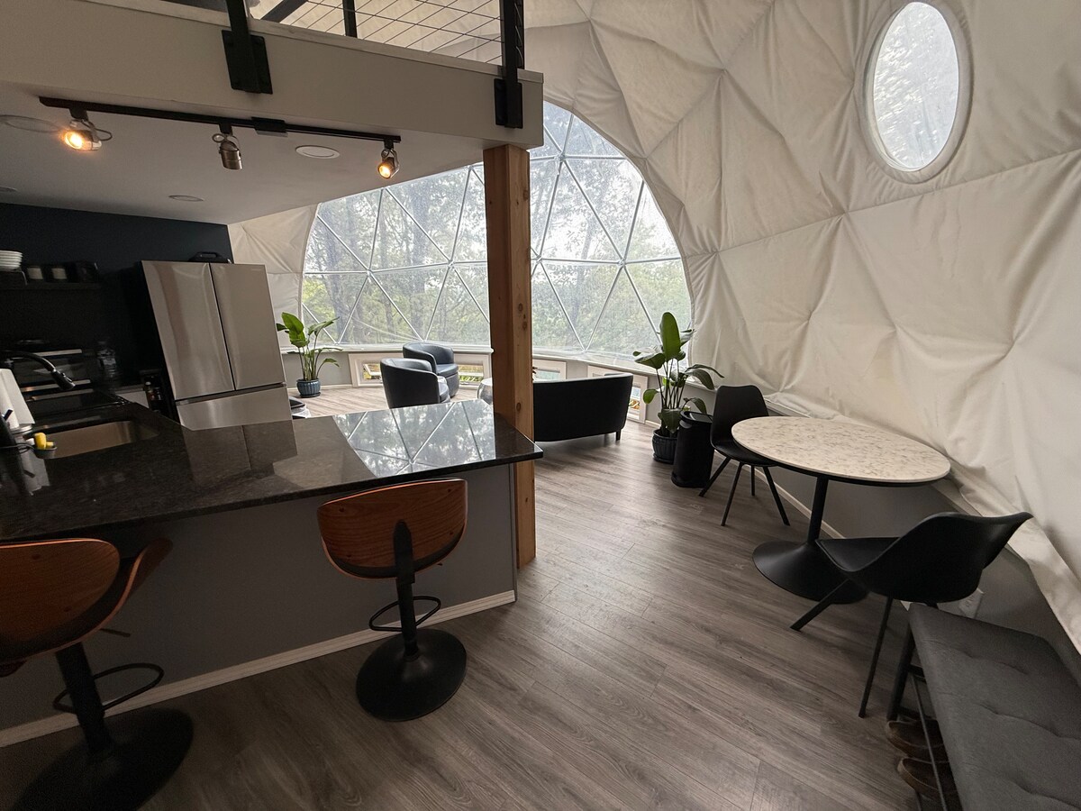 Acres of nature surround and insulate your moment of rest here at the Laurel Zome. With intriguing geometry drawn directly from the architecture of mountain laurel blossoms, pangolin scales, and pinecones—the simplicity and focus of the zome allows a lofty experience. Wake to natural light spilling in from expansive faceted windows and skylights. Enjoy the ritual of stoking a fire to prime your body to slip into downy sheets for sleep, or into to the waters of your Koto Elements spa tub.