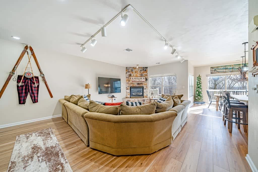¡No busques más la escapada RELAJANTE perfecta para cualquier ocasión! Nuestra casa tiene capacidad para 6 adultos cómodamente con 2 dormitorios, una sala de juegos completamente *renovada* con sofá cama tamaño queen y 2 baños completos. ¡Despiértate y disfruta de una taza de café caliente acurrucado junto a la chimenea o en nuestra terraza extendida, y disfruta de las espectaculares vistas al bosque! Nuestra casa es perfecta para todas las estaciones e incluye una piscina comunitaria, cancha de tenis y servicio de transporte de cortesía que te lleva a cualquier lugar del centro vacaciones Seven Springs.
