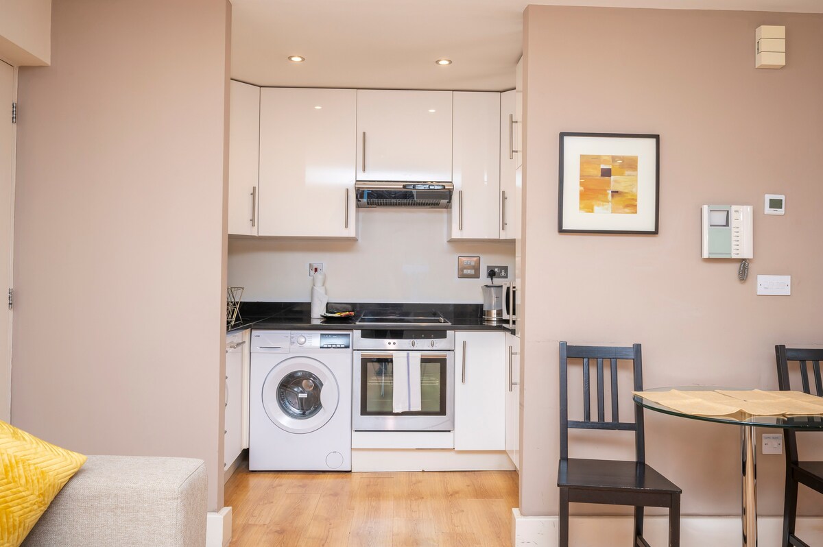 Un exquisito apartamento tipo estudio situado a la vuelta de la esquina del histórico Hatton Garden, el famoso barrio de joyería de Londres y el centro del comercio de diamantes en el Reino Unido, diseñado e ideal para dos personas, equipado con una cama tamaño king. El estudio ofrece aire acondicionado, armario y baño privado con ducha y secador de pelo. Las comidas se pueden preparar en la cocina bien equipada, que cuenta con fogones, nevera, utensilios de cocina y microondas.