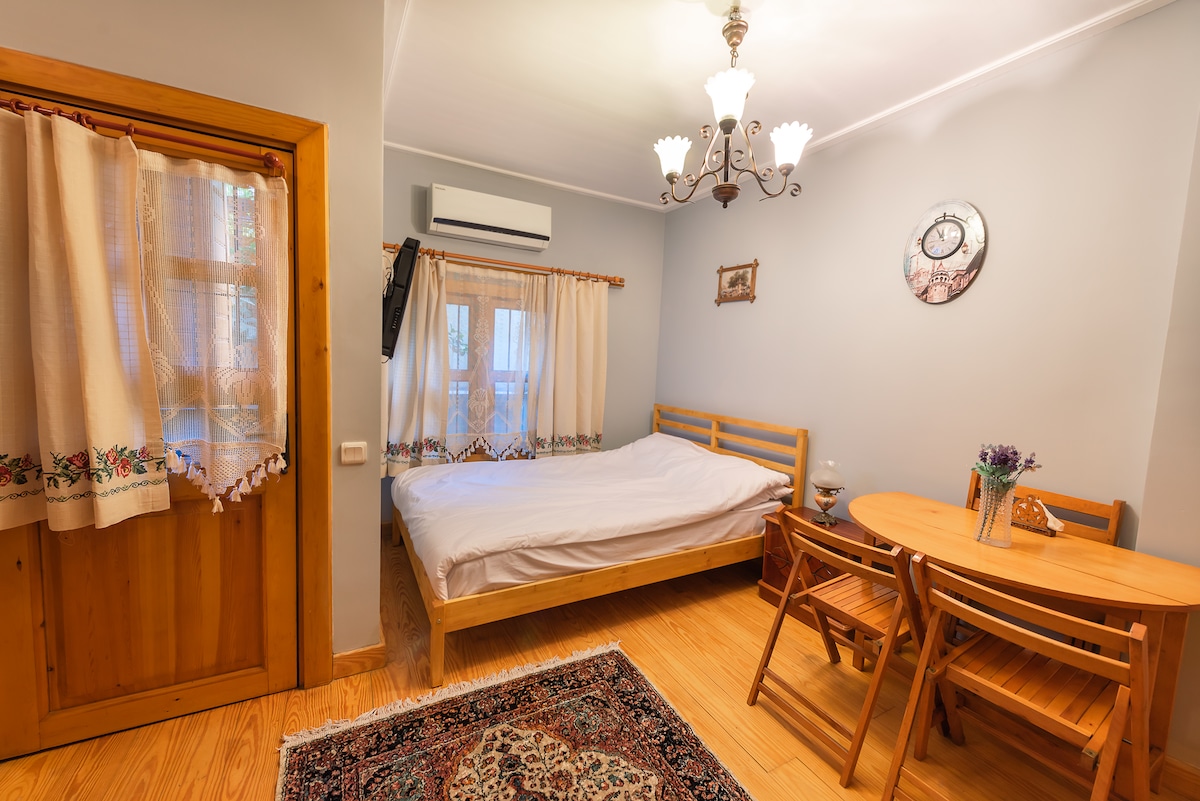 Bienvenidos a nuestra histórica casa Esta casa es mucho más que un lugar para alojarse; es una puerta secreta conectada al antiguo monasterio de Pammakaristos, ahora llamado mezquita de Fethiye, al otro lado de la calle. Según la leyenda, un sacerdote vivió aquí y veló por las oraciones y los secretos. En el sótano de piedra, se recitan oraciones silenciosas; la puerta baja obliga a todos a inclinarse respetuosamente. Estas paredes aún resuenan con los susurros de antiguas creencias. Espero que sientas y honres este espíritu y vuelvas a la historia de este lugar sagrado.