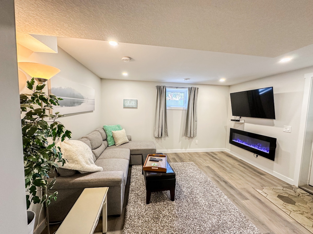 El elegante sótano de 2 dormitorios es un refugio privado y meticulosamente seleccionado que ofrece un confort refinado y un lujo tranquilo. Disfruta de cálidas noches junto a la chimenea y de la abundante luz natural de los grandes ventanales. Esta espaciosa suite de dos dormitorios cuenta con una cama tamaño queen y una cama doble ideal para los huéspedes que valoran la privacidad, la limpieza y un elevado nivel de confort. Se incluye acceso directo al patio trasero y estacionamiento exclusivo en la entrada. A pasos de los senderos del río Bow, Sobeys, Seton YMCA y South Health Campus Hospital.
