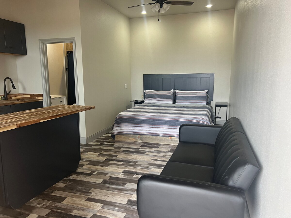 Enjoy a peaceful, restful stay in our cute little Alley House Getaway for up to 3 people. It’s a tiny 1 bedroom apartment with a queen bed, a loveseat that makes into a twin bed if needed, and 2 wall-mounted tvs. The kitchenette offers a coffee station, refrigerator/freezer, portable cooktop, and a microwave. The cabinets are stocked with all your cooking needs. The apartment includes 2 split ac/heating units for added comfort.