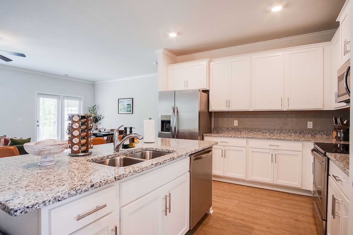 Entra para descubrir un espacio habitable elegantemente amueblado, adornado con una decoración contemporánea e inundado de luz natural. Esta propiedad tiene capacidad para 8 personas, por lo que es una opción ideal para familias o grupos de amigos. El departamento cuenta con una variedad de excelentes servicios, que incluyen una bañera profunda, wifi gratuito, televisión inteligente, 2,5 baños, una cama tamaño king, una cama tamaño queen, 2 camas individuales y 2 colchones inflables tamaño queen. La comunidad está a poca distancia en coche del centro de Savannah y del aeropuerto Hilton Head.