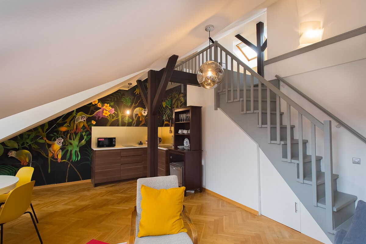 Découvrez ce loft romantique de 80 m² conçu par un architecte et décoré par nous, un havre de paix pour un week-end en amoureux. Profitez d'un jardin de bambous privé, d'un design unique et d'une chambre en mezzanine avec lit king-size. Idéalement situé à 15 minutes à pied de la gare centrale, c'est un point de départ parfait pour explorer Prague. Saviez-vous que ce lieu porte en lui un passé insolite ?…Un séjour authentique et inspirant vous attend.