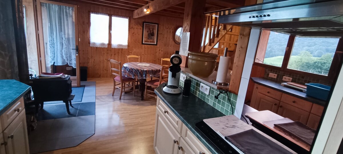 Gîte de moyenne montagne (600m), vue panoramique, à 25mn de l'A64, 1h de Toulouse. Il comprend 1 grande chambre pour 1 couple et 2 petits enfants, 1 lit de 160, 2 de 90 en sous-pente , cuisine équipée ouverte sur salon-salle à manger, salle d'eau avec douche italienne, lave-linge, cellier, WC séparés. Salon jardin et barbecue. Poêle à bois pour initiés. Linge fourni. Terrain clos. Office du Tourisme, épicerie, marché dominical à 3km. Restaurant au village. Animaux "sociabilisés" bienvenus.