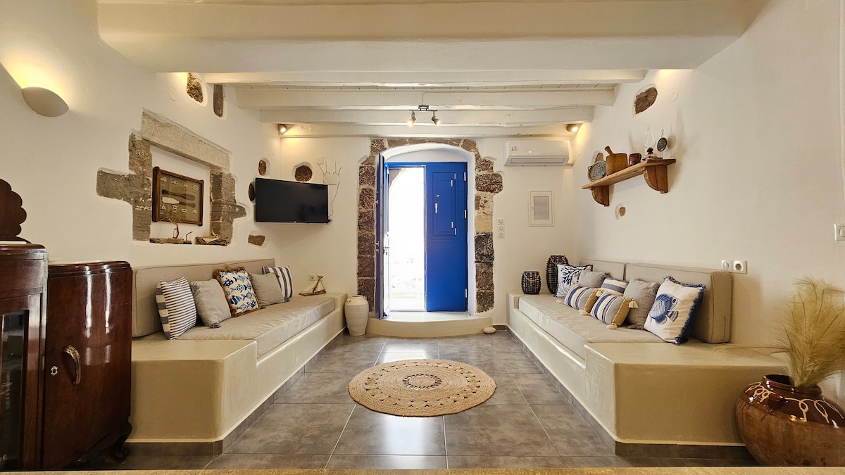 A traditional Fisherman house. One bedroom with double bed.Fully equipted bathroom. In the living room (bed/sofa for a 3rd visitor) you can find and a fully organized kitchen and a dining table.Balcony with amazing view to the Aegean Sea! One traditional “SIRMA” in which fishermen storage their boats for the winter. It's located into the fishermen village called Klima. Fully renovated (2019), with many traditional tips from its past. Perfect place for teleworking ... gazing at the Aegean Sea!!