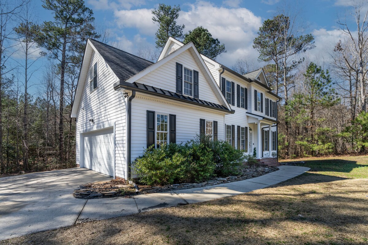 Ubicada en la cima de una colina rodeada de 3 acres de zonas boscosas, nuestra hermosa cabaña de estilo alpino recientemente renovada está a solo unos minutos del centro de Wake Forest y a 20 minutos del centro de Raleigh. La cabaña de montaña en la ciudad es extremadamente privada, a la vez que ofrece tiendas, restaurantes y actividades a poca distancia. Hay un «libro de bienvenida» sobre la mesa al entrar en la casa con las normas de la casa, información sobre la propiedad y actividades locales. También disponible en línea, consulta el manual de la casa.
