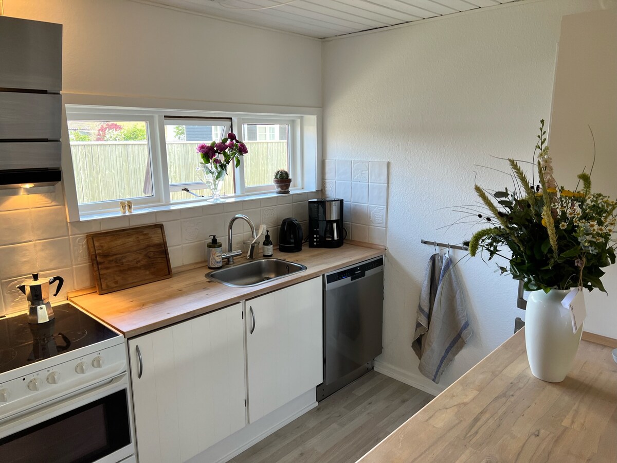 Acogedora y bien equipada casa de 1 1/2 plantas con mucho encanto, cerca de Palmestranden. La casa contiene una gran cocina, salón, baño, lavandería con lavadora y secadora. 3 dormitorios, (1 en la planta baja y 2 en el primer piso) La casa tiene escaleras y, por lo tanto, no es adecuada para niños pequeños. Bonito jardín grande y tranquilo con varias terrazas, tumbonas, muebles y parrilla de gas. Si el clima no acompaña, hay un gran invernadero agradable con zona de comedor y rincón acogedor. No se admiten mascotas.