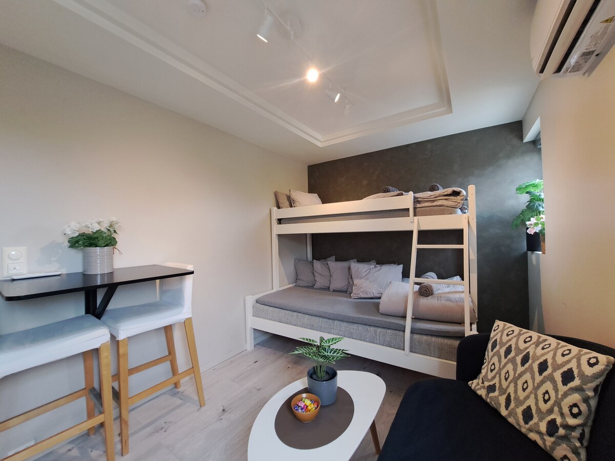 (Estacionamiento gratuito) aire acondicionado/bomba de calor y calefacción por suelo radiante. buen clima interior. Apartamento tipo estudio de menos de 30 m². La cama es una cama doble pequeña de 120x200 cm abajo y 75x200 cm arriba. La cama de invitados se puede colocar en el piso y mide 90x200 cm. Elige entre un colchón inflable eléctrico o una cama de campamento. Cocina con la mayoría del equipo. Cubículo de ducha en el baño. Amplia terraza orientada al sur con pabellón y muebles de exterior. Bonito lugar a un buen precio.