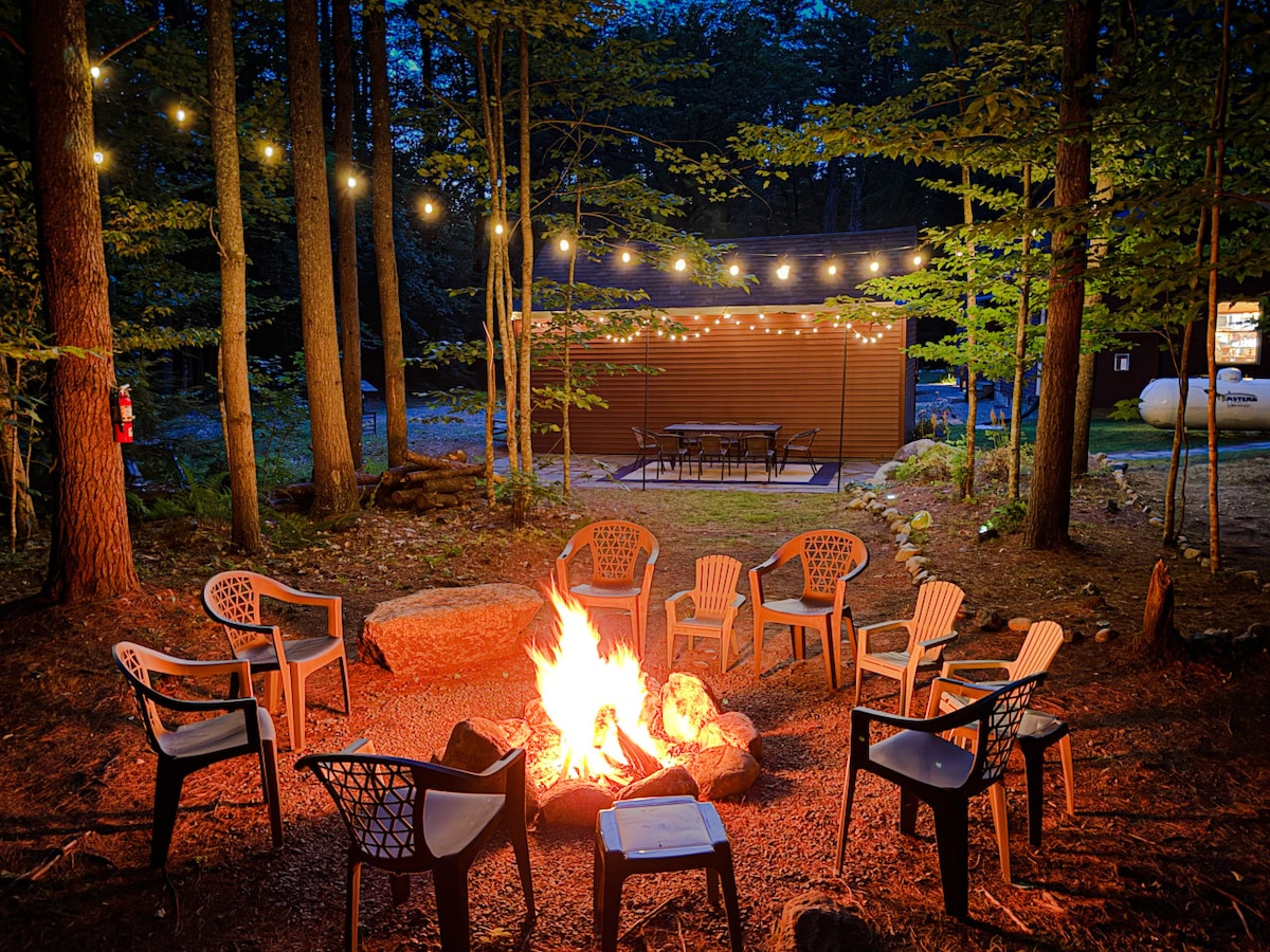 ¡Esquí de primavera! ¡Descuento de 20 %d en azúcar y nieve! Marzo es el azúcar de arce y la temporada de nieve GRANDE en Bretton Woods (a solo 20 minutos). Lujosa cabaña en estanque privado con jacuzzi, chimenea al aire libre, mesa de fuego de gas y vino de cortesía, cocina completa, porcelana fina, ducha nueva, bañera de hidromasaje, chimeneas eléctricas y dos espacios de trabajo. 68 acres + millas de senderos a un bosque estatal cercano, esta es la base perfecta para esquiar en temporada alta y una aventura invernal serena. ¡Se admiten perros!
