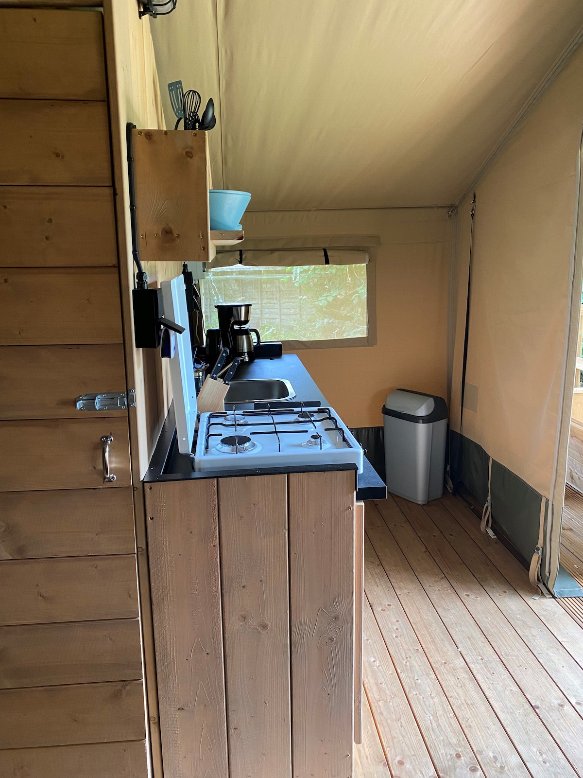Tienda de safari amueblada con instalaciones sanitarias privadas para 4 personas con hermosas vistas rurales. Con una superficie de 40m2 y una altura de pie en toda la tienda, hay mucho espacio. Hay 2 cabañas para dormir, cada una con 2 box spring. En la cocina encontrarás vajilla y todo lo que necesitas para cocinar. También incluyen cafetera, hervidor de agua, nevera y nevera. Junto a la tienda de safari se encuentra su propio bloque sanitario: ducha, inodoro y lavabo y lavavajillas. En la terraza, usted puede relajarse.