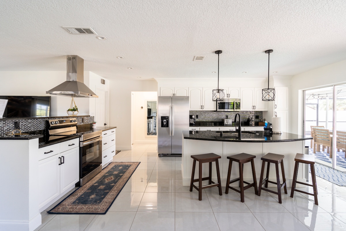 Tu familia estará cerca de todo cuando te hospedes en este alojamiento céntrico. A 15 minutos de Siesta Beach, a 10 minutos del centro comercial UTC, a 15 minutos del centro de la ciudad y a 20 minutos del aeropuerto SRQ. Esta casa está totalmente remodelada, totalmente amueblada, capacidad para 8 personas. Tenemos 1 cama tamaño king en el dormitorio principal, el segundo dormitorio tiene una cama tamaño queen, el tercer dormitorio tiene 1 cama completa y 1 cama individual. Esta es una casa de planta abierta con una gran sala de estar, TV de 60 pulgadas sobre la chimenea eléctrica, comedor formal con capacidad para 6 personas y bar con capacidad para 4 personas. El dormitorio principal tiene TV de 55 pulgadas.