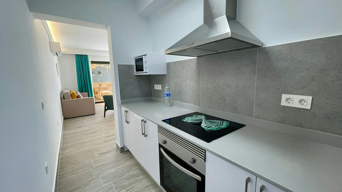 Estupendo apartamento totalmente reformado. Cuenta con dormitorio doble, baño con plato de ducha extraplano, grifería con efecto lluvia y secador de pelo, luz LED perimetral y aire acondicionado en salón y dormitorio, sala de estar con sofá cama, caja fuerte de alquiler, Smart TV vía satélite, mesa de comedor, zona de cocina con microondas, nevera, tostadora y cafetera y terraza amueblada con vistas a los alrededores. La ropa de cama y las toallas están incluidas. El uso del aire acondicionado conlleva un suplemento. Wifi gratuito.