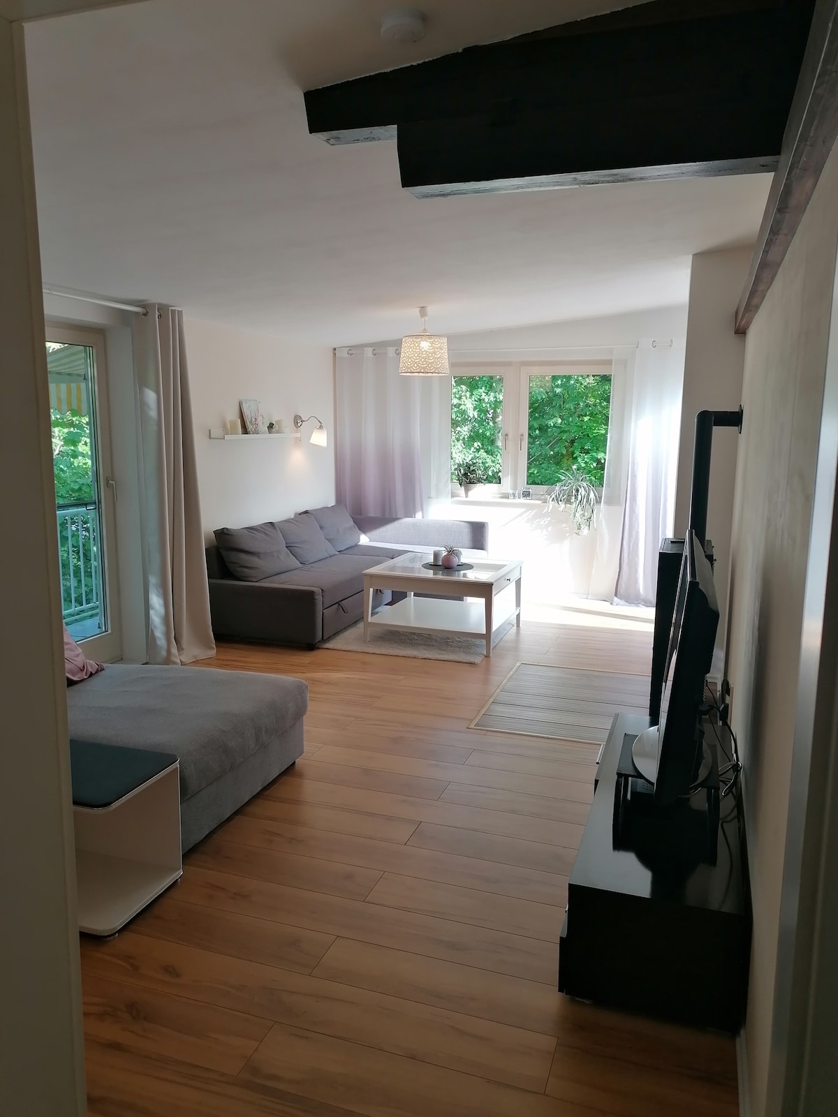 Perfectly located for Munich. Stylishly renovated ground floor apartment in period building with large garden and natural pool. Warm log fire in winter. 2 spacious double bedrooms with cosy beds, large living room with fireplace, 2 sofa-beds in living room, doors onto terrace & gardens. Polished parquet floors throughout. Your own personal breakfast terrace with views onto the beautiful garden. Easy parking and/or S-Bahn just 5mins walk away, 20 mins train to city centre. 100% renewable!