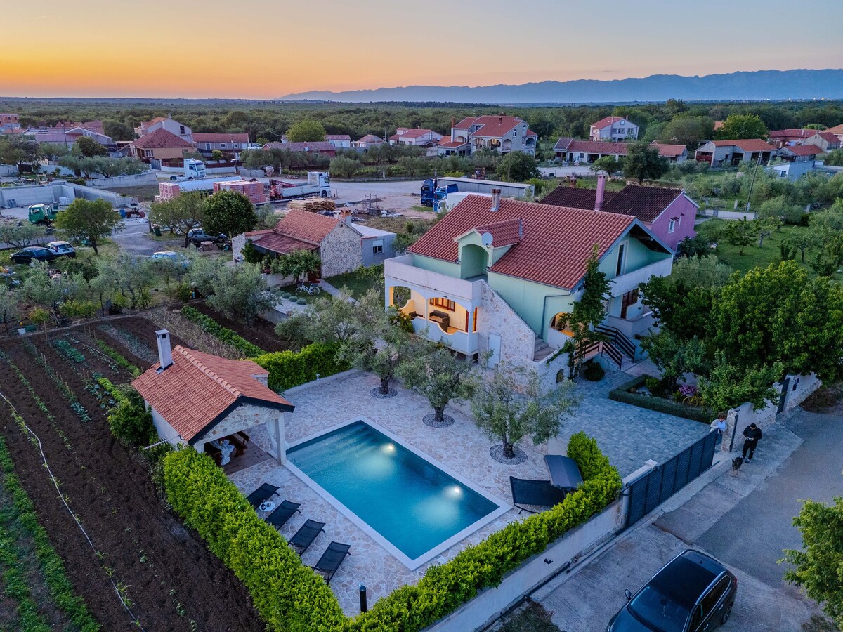 Authentic mediteran stone house with big heated Pool (30m2 with jacuzzi bench) in village near Zadar. Total area of land is 300m2 with private parking, garden,big heated pool,6 wooden sunbed and two big terasses with lounge .For fun there is billiard,table tenis,goal for fotball, picado. House is located in small village away from city noise. It has a beautiful open view on the nature and mauntines. You can enjoj at complete privacy. House is souranden by fields and you can see domestic animals