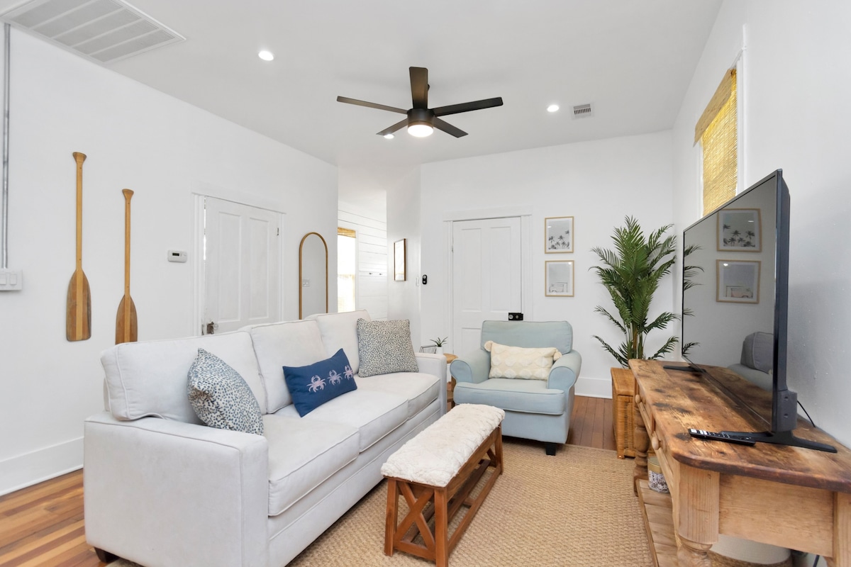Adorable casa de campo de 2 dormitorios y 1 baño a 3 manzanas de la playa y a pocos minutos de varias atracciones de Galveston, incluido el muelle histórico de Galveston Island, el parque acuático Schlitterbahn, Moody Gardens y mucho más. Esta casa de campo de estilo artesanal de 1923 recientemente renovada sería perfecta para un fin de semana romántico o una escapada familiar. Los servicios incluyen: bañera de hidromasaje, parrilla de gas, Keurig, cocina totalmente equipada, lavadora/secadora y lavavajillas.