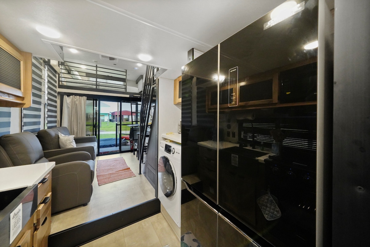 🌴 2024 Bayside Camper | ¡Camina a la playa + Margaritaville! ¡Alójate en nuestra luminosa y moderna casa rodante a solo unos pasos de la bahía y a 1 milla de la playa! Capacidad para 6 personas con 1 cama tamaño king, literas, sofá jackknife, 1,5 baños, cocina completa y patio cubierto. Cuenta con toallas, utensilios de cocina, Keurig y equipo de playa. ¡Cerca de restaurantes, música en vivo y diversión! Relájate, recarga las pilas y disfruta de lo mejor de Crystal Beach.