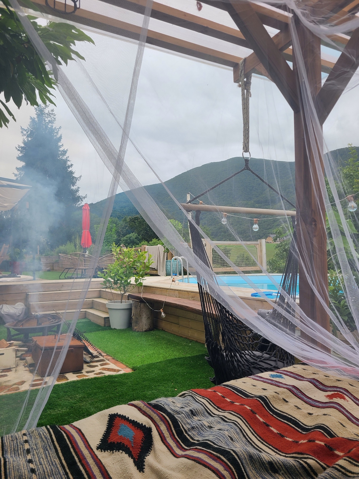 A 5 minutos de Pau y de todos los servicios, nuestro Airbnb de 110 m² te espera en la planta superior de nuestra casa, con acceso privado. Encontrarás dos grandes dormitorios de 20 y 30 m2 ,baño , una cocina totalmente equipada, así como un salón con televisión y acceso a las plataformas de streaming .Disfruta también de la piscina con vistas a los Pirineos, un brasero, una barbacoa y un jardín de 5000 m². En el lugar, los niños disfrutarán de la compañía de nuestros animales