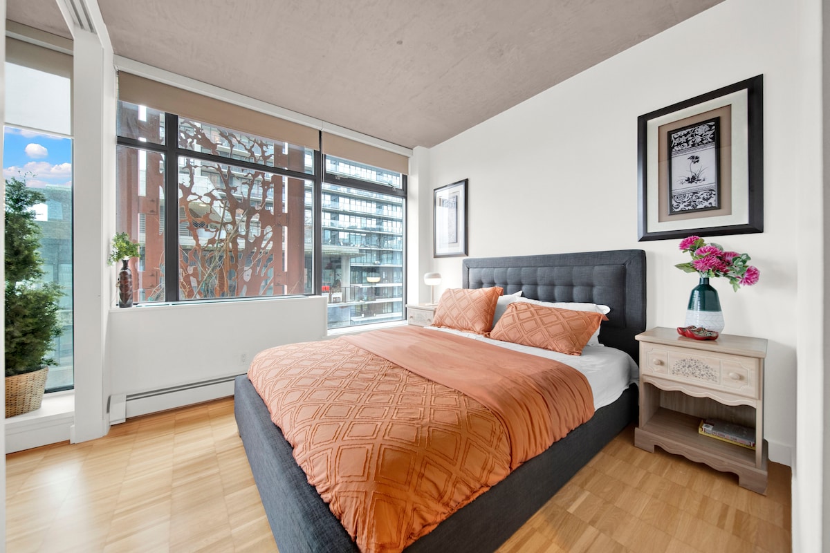 Le damos la bienvenida a nuestro elegante y céntrico alojamiento, situado a 10 minutos a pie del Rogers Arena, del estadio FIFA 2026 BC Place y del Centro de Convenciones. Este espacio de concepto abierto de alta gama ofrece una experiencia verdaderamente única con sus techos elevados de 11 pies y su diseño moderno. Para garantizar una estadía sin complicaciones, ofrecemos estacionamiento seguro para su comodidad. Despierte y disfrute de un café Nespresso recién hecho, que le dará el impulso perfecto para su día de exploración por la ciudad.