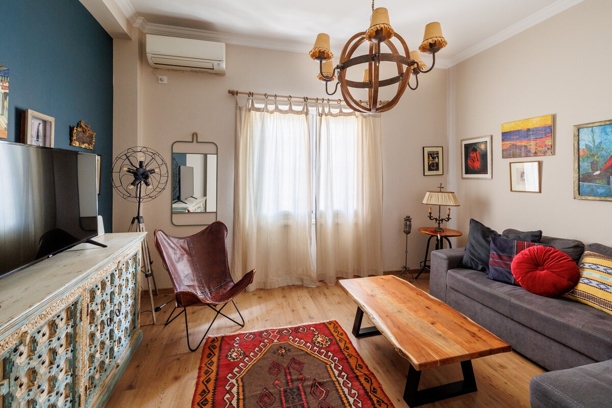Departamento soleado y encantador. Este acogedor y elegante apartamento de 56 metros cuadrados está lleno de pequeños toques encantadores, incluidos objetos extravagantes de arte y algunos accesorios funky. ¡Las luces suaves y bien pensadas junto con la decoración tranquila te harán sentir como en casa en el momento en que entres! Este hermoso departamento está ubicado en Gazi, una base ideal para disfrutar de los monumentos históricos que Atenas tiene para ofrecer, mientras disfrutas de la energía y el ritmo especiales de la vida urbana local.