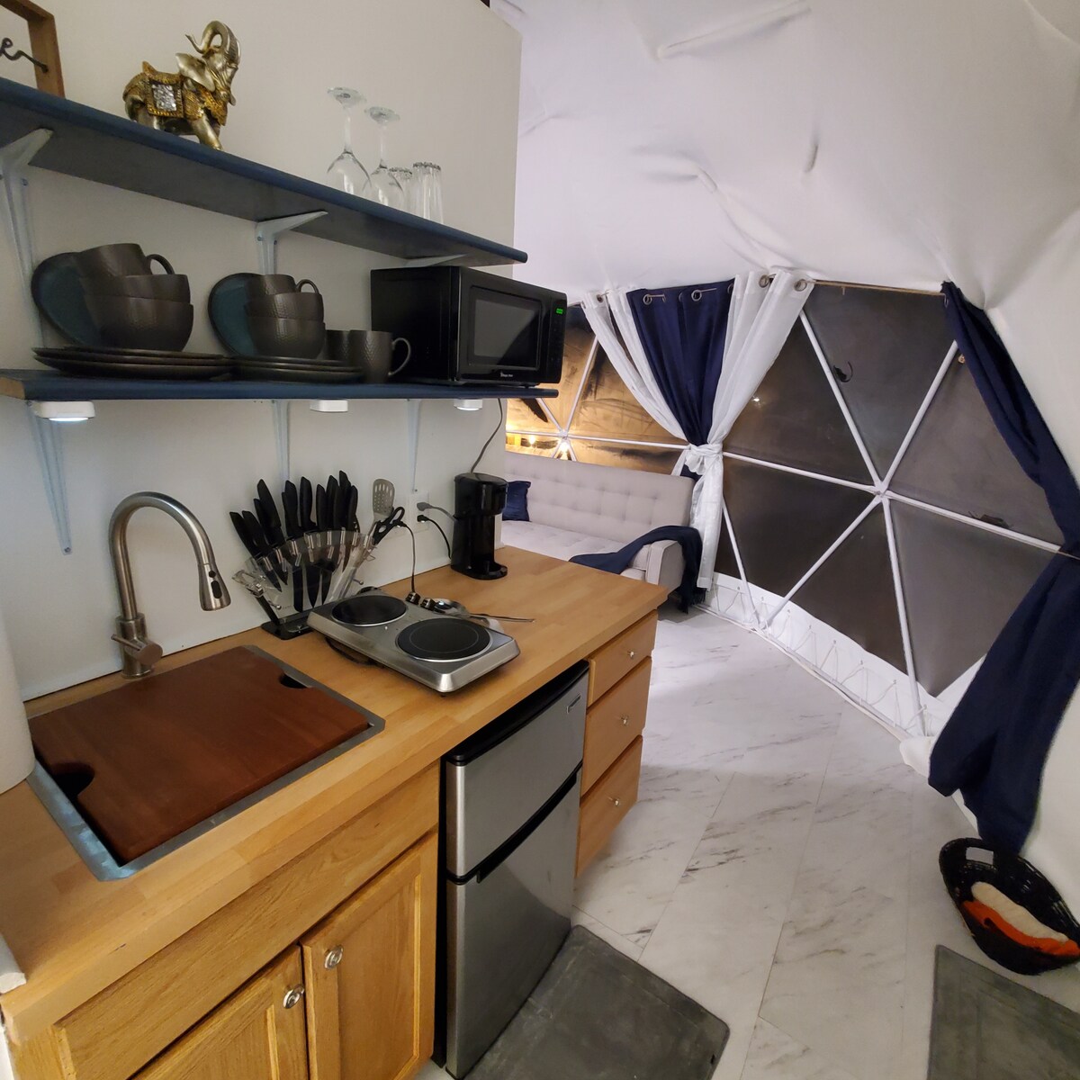 ¡Disfruta y relájate en nuestra cúpula glamping geodésica de diseño! Esta experiencia de glamping de lujo única te ayudará a relajarte, desconectarte y conectar con la naturaleza. ¡Experimenta el glamping fuera de la red con todas las comodidades de lujo! Diseño de estilo penthouse cargado por el diseñador, TV de 65 pulgadas con Netflix, Hulu, etc. ¡Colchón de memoria y lujosas sábanas de lujo en el dormitorio de abajo y loft queen arriba! ¡El tocador doble y la ducha de efecto lluvia con agua caliente proporcionan una experiencia de hotel de lujo de 5 estrellas mientras acampas!