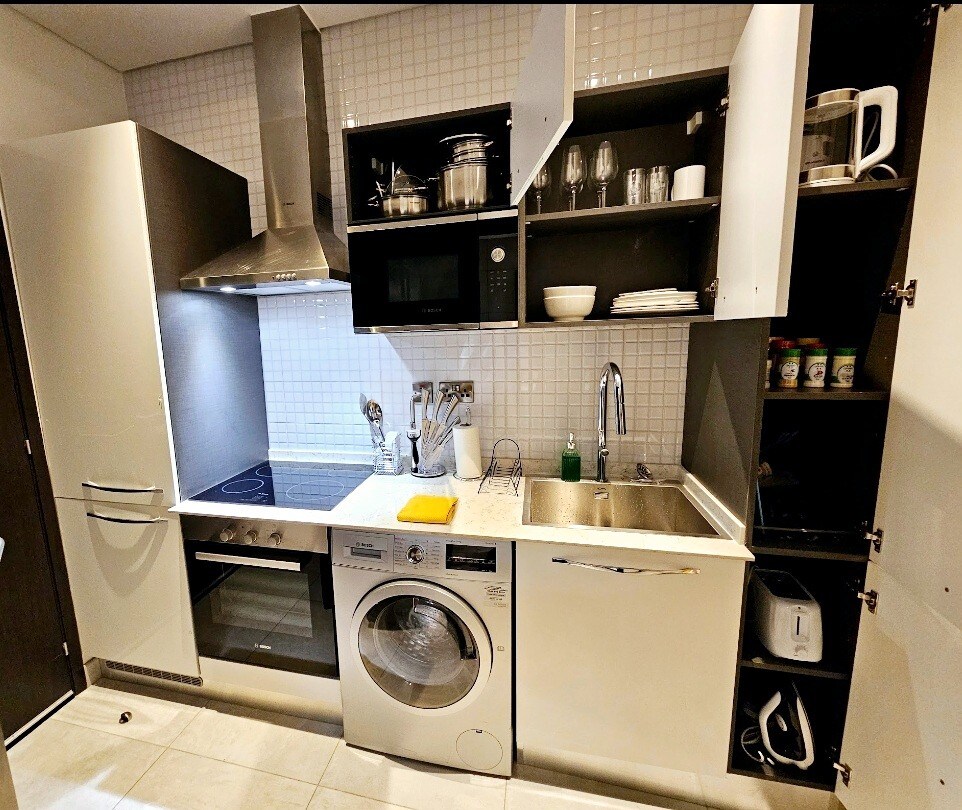 Enjoy a stylish stay in this modern studio at Harmonia Residence, ideal for business or leisure. Guests have access to a modern pool, cinema area, children’s playground, and a fully equipped gym with lockers and showers. The building is eco-friendly, featuring lush greenery and a green waste management plan for sustainability. Includes underground parking, 24-hour security, and 24-hour power. Just 10–12 minutes from the airport and 5 minutes from Kozo, Santoku, and Sky Bar.