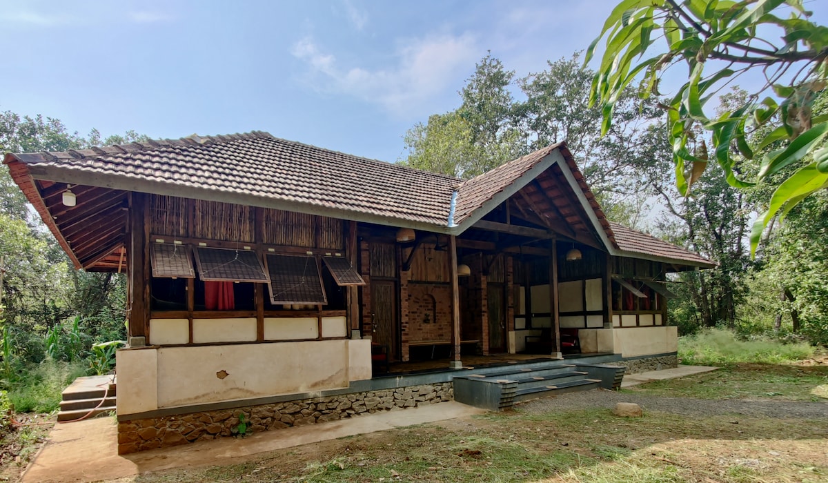 Welcome to 'The Open House,' an artfully designed slow-living retreat that offers the perfect escape into nature, and tries to frame its natural surroundings. Nestled within the 1-acre permaculture landscape of 'Saukhya Farm,' this unique home immerses visitors into the tranquility of a regenerative tropical food forest cultivated by our family. Our passion for nature, native species, and natural farming has flourished as we have developed this land since the lockdown.