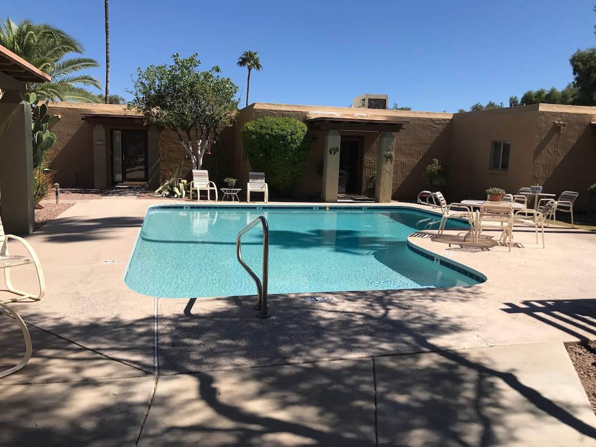 Turn key Condo! Beautifully upgrade 2 BR Condo in a very quiet area of East Mesa! New air conditioning, washer-dryer in unit. Everything you need for your stay, linens, towels, dishes, all the kitchen gadgets you can think of, 2 wall-mount TVs, high speed internet. ROKU in living and master, with YouTube TV, Prime, Hulu and others all active. Picky about your Pillow? Got you covered, with flat ones, standards, and "Black Label" fluffy ones! Quiet downstairs unit, in the back of a small complex