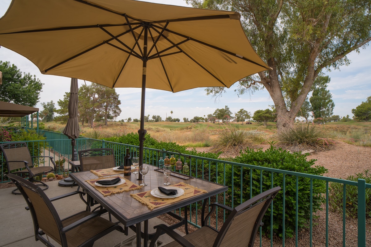 Beautiful well-appointed condo in a gated golf course community. The spacious patio overlooks ponds abundant with waterfowl for peaceful al fresco drinks and dining. It is located steps from the pool and hot tub. Restaurants, grocery and coffee shops are an easy stroll away. We are located right off the freeway for easy travel to the exciting Gilbert and Downtown Chandler nightlife. Filtered drinking water, cable TV, and high-speed WiFi included. Book now!