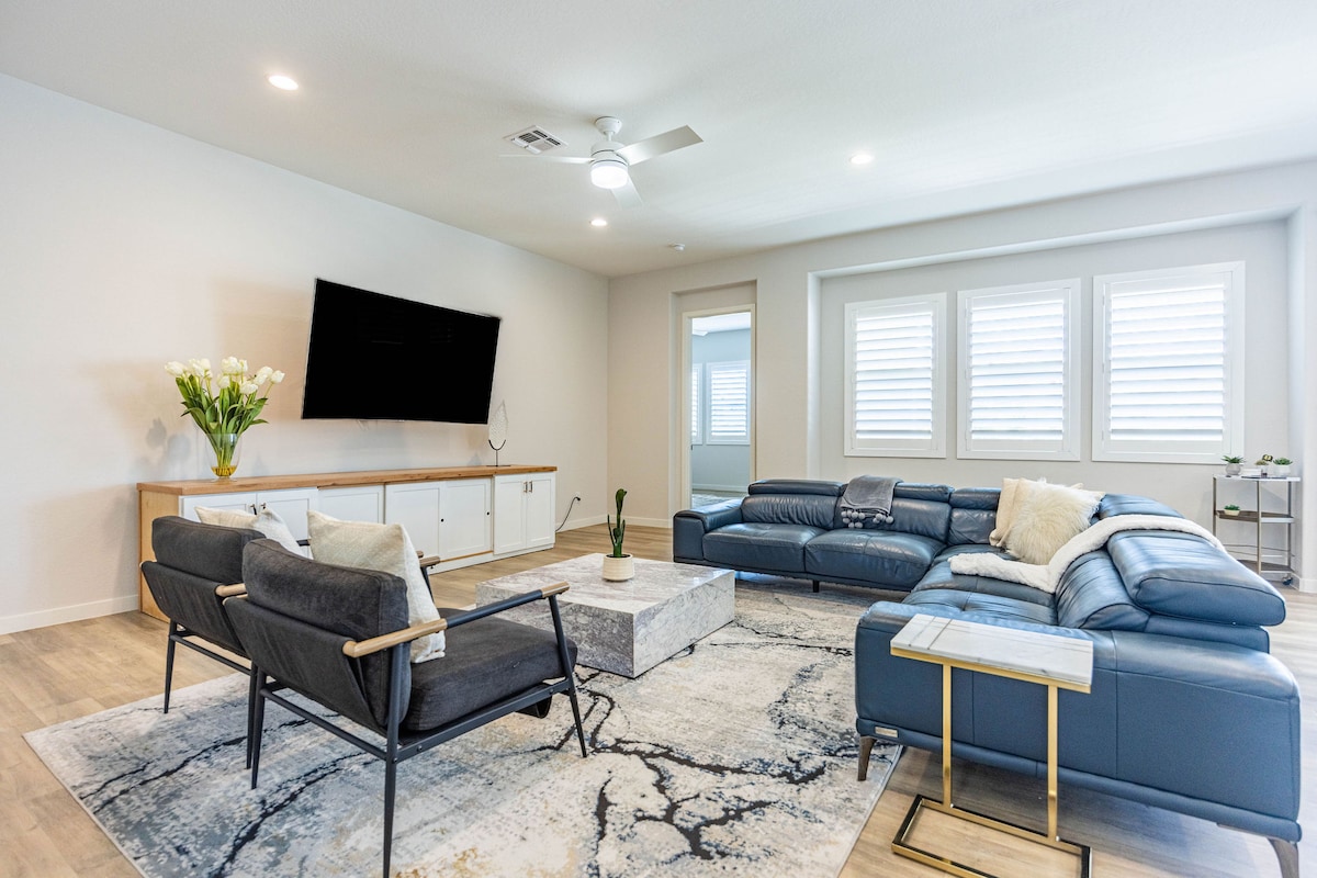 Are you ready for a retreat? -Private pool/spa -Adjustable king bed, plus two queen beds & two twin beds -Hotel quality beds, pillows & linens -Two living rooms (one with a motorcycle bar!) -TVs in every room (Netflix & Amazon Prime ready) -High-speed WIFI -Fully stocked coffee station -EV charging station (Level 2) -Electric backyard grill -Backyard sitting and dining areas -Front patio sitting area -Fully stocked kitchen -Washer and dryer -Air conditioning ...and more. Book your stay now!