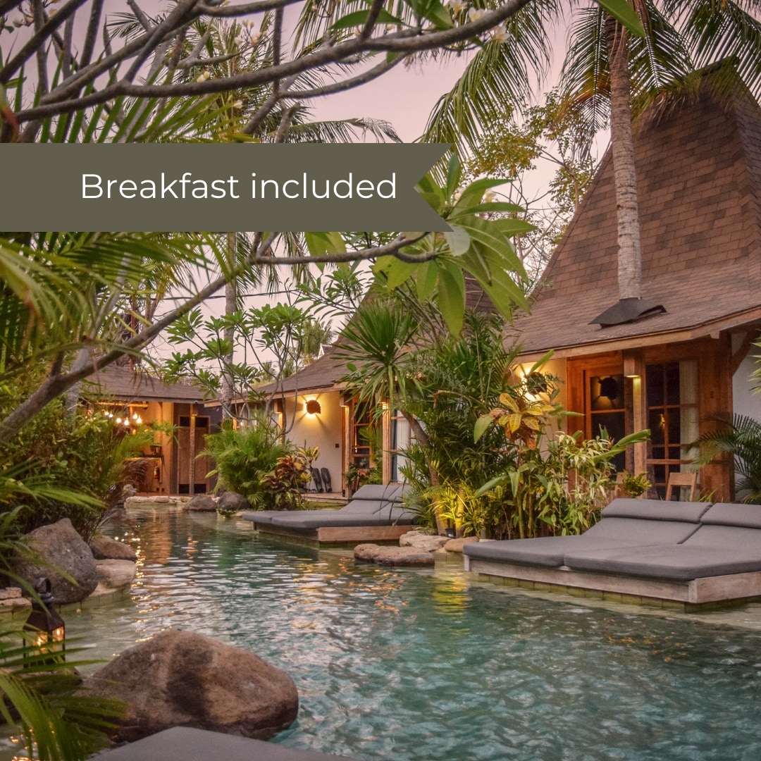 Entra en un mundo donde el diseño indonesio y francés se fusionan, creando una escapada única y lujosa de cuatro estrellas. El diseño interior de cada villa está diseñado por artesanos locales, bajo la dirección de un diseñador francés. Relajarse en el lujo es muy sencillo aquí. Despiértate, da un paso fuera del dormitorio prémium de estilo tradicional, relájate al sol junto a tu propia piscina privada en una tumbona o relájate en el sofá de la sala de estar al aire libre