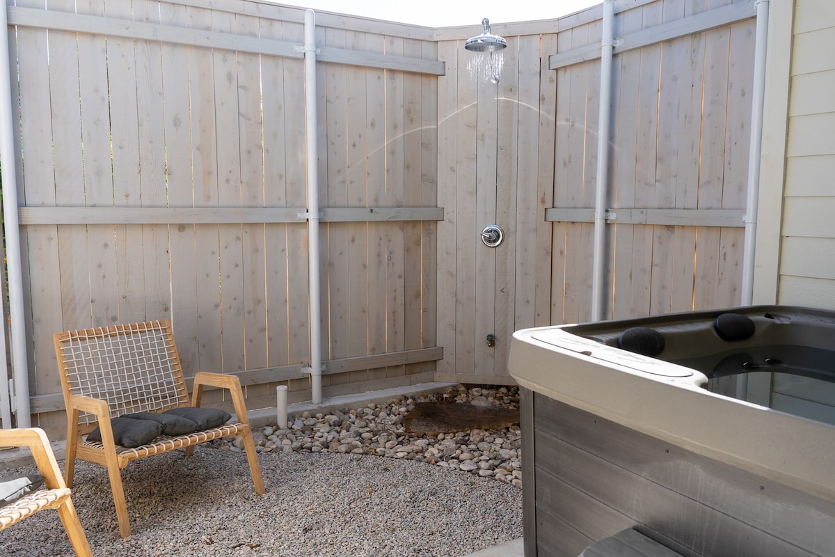 Disfruta de un refugio moderno en el número 5, con patio privado y jacuzzi en Fredericksburg, Texas. - Distribución estilo estudio con cama tamaño king y chimenea de gas. - Ambiente relajante con un ambiente de escapada privada - Cocina pequeña con mininevera, microondas y cafetera. - Patio privado con bañera de hidromasaje y ducha exterior. - Acceso wifi gratuito. - Llegada a las 4:00 p. m., salida a las 11:00 a. m. (llegada anticipada disponible por una tarifa previa solicitud) - No se admiten mascotas ni fumar en la unidad.
