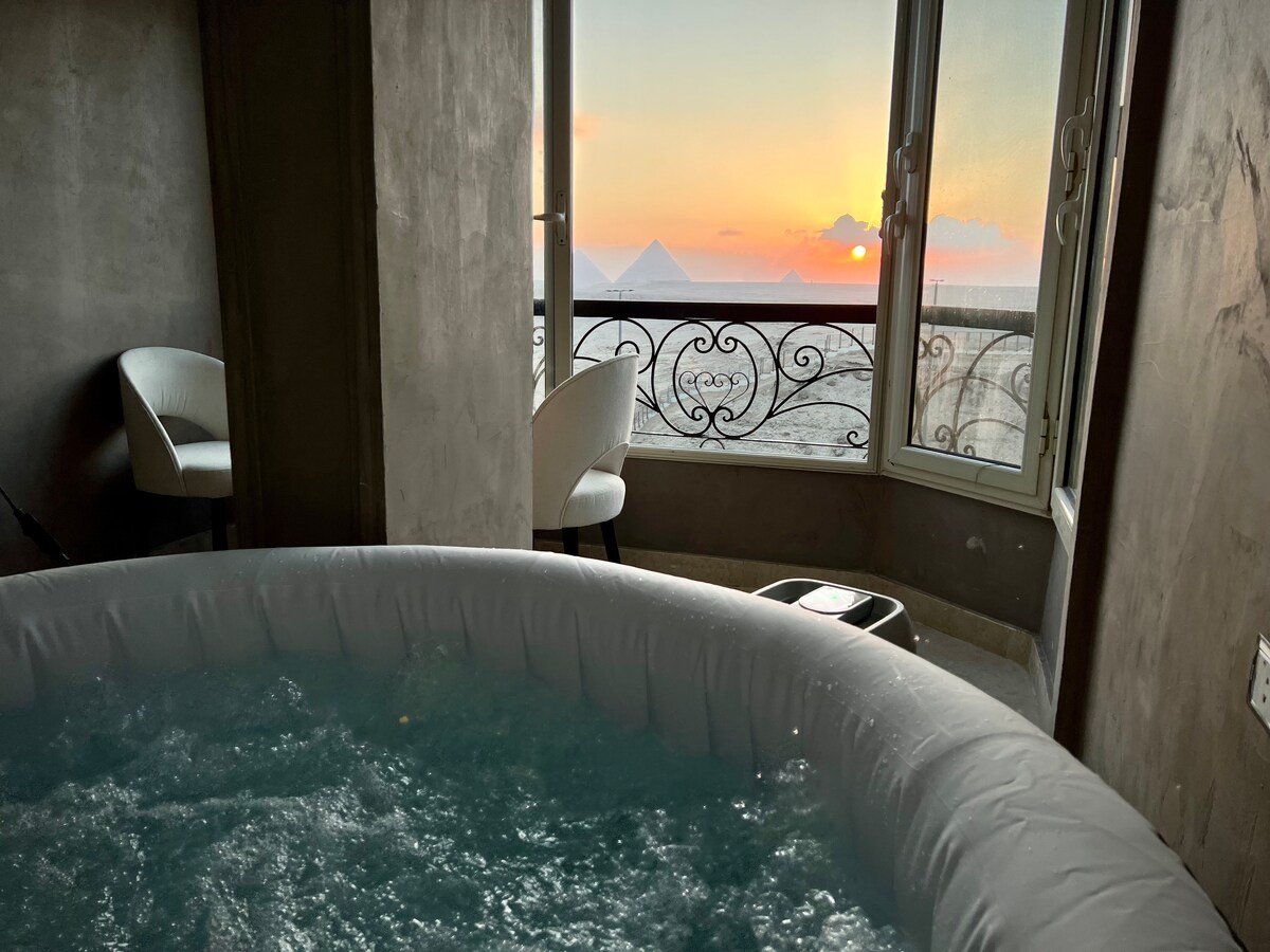 Big apartment ( 150 M² ) has a Jacuzzi with Pyramids view in OLD GIZA ( Nazlet El-Samman ) in small street , the apartment is full with antique furnitures & salt lamps for positive energy, apartment has 2 big suites, each suite has an attached bathroom, the balcony is about 30 metres square and there is an elevator, there is hot water and Air-condition .. very good internet.. There is free breakfast, water, coffee & tea, also you can use the washing machine