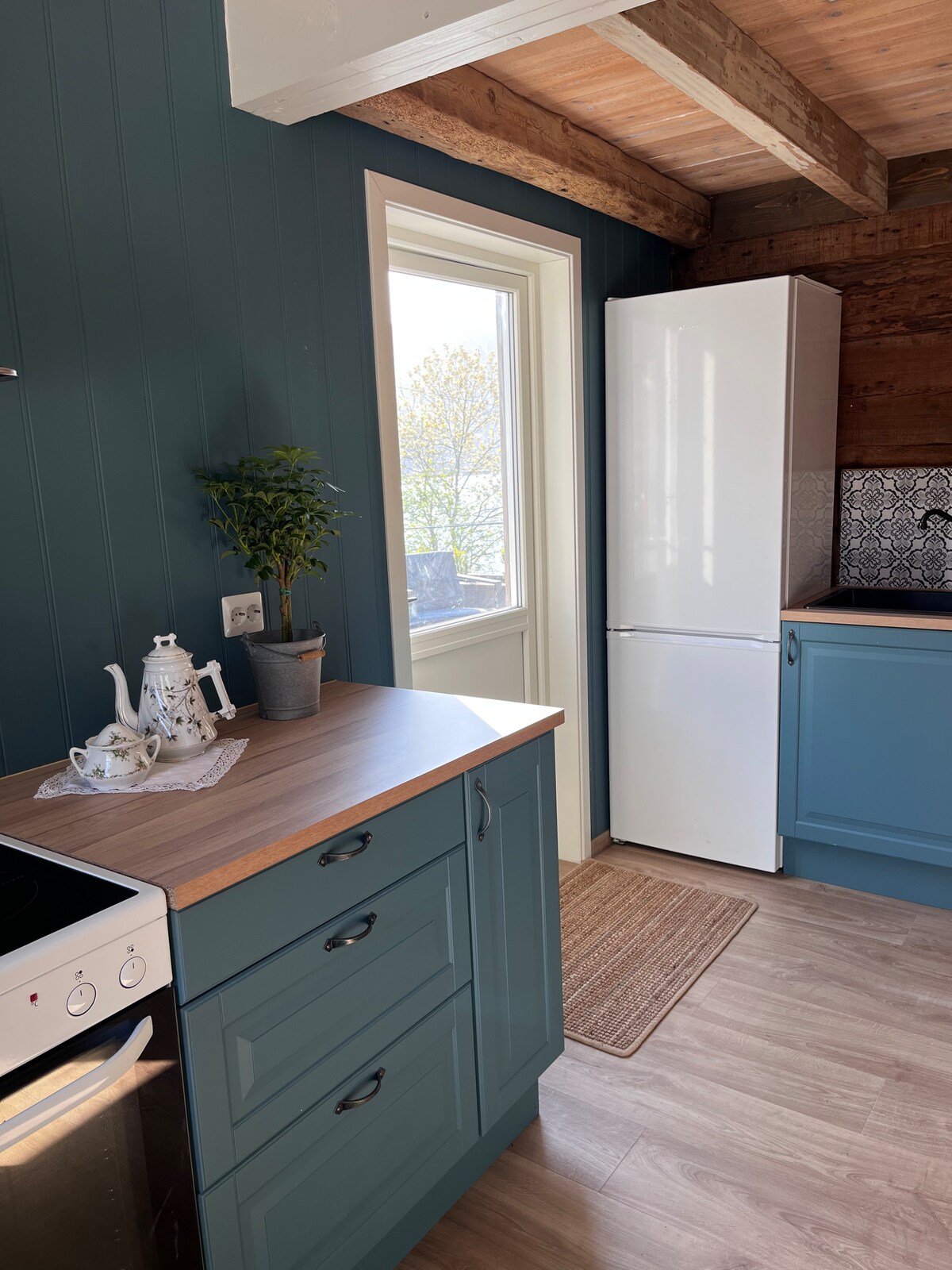 Esta es una cabaña antigua con decoración sencilla y fuente de alimentación con panel solar. Existe la posibilidad de cargar un teléfono móvil en el enchufe USB. Hay una chimenea con leña,posibilidad de barbacoa, nevera y estufa/cocina con gas. Hay platos,boles,vasos,tazas y cubiertos, rebanadora de queso y abrelatas. No hay agua corriente,por lo que llenamos las latas de agua con agua potable limpia,que se puede utilizar tanto para cocinar como para lavar platos. La letrina está preparada fuera de la cabaña Alquiler de sábanas 150,- por juego por persona A 120,- por maleta.