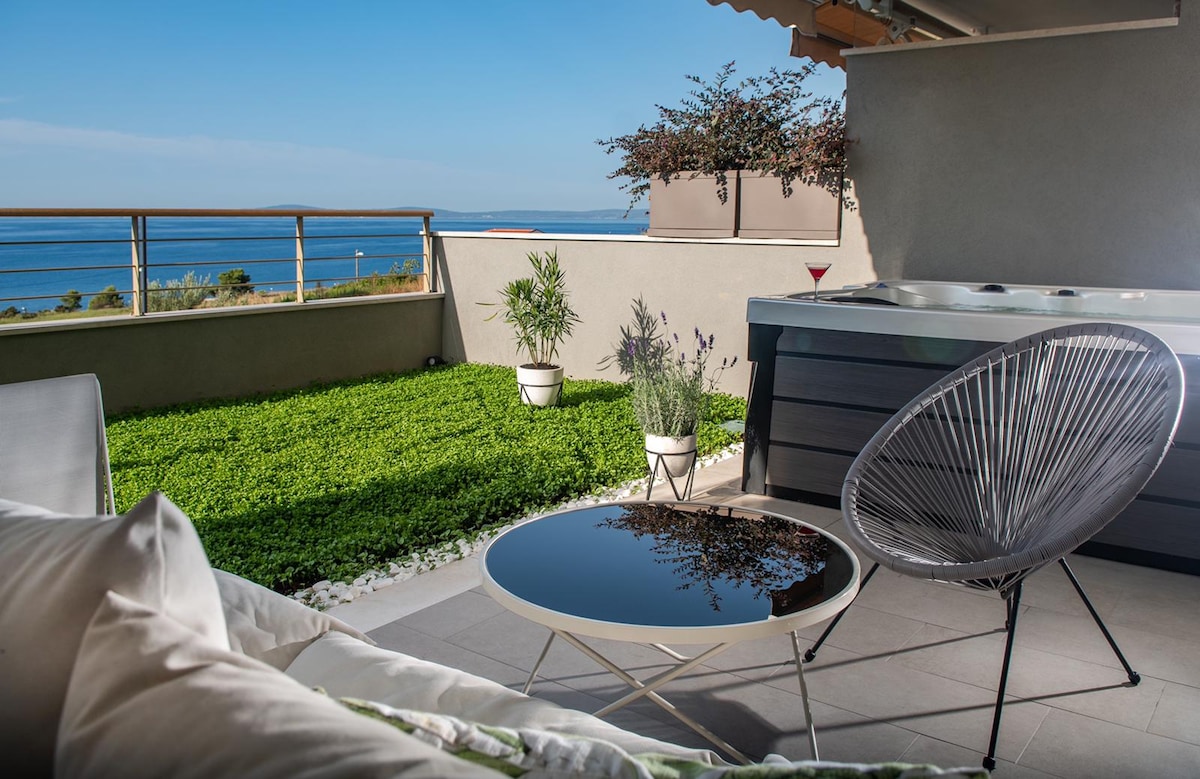 ZALOO sea-view luxurious apartment with hot tub. Apartment Zaloo (62 m²) is a brand new residence located in Split, Dalmatia region near the city beach Žnjan. The apartment features a beautiful sea view from both the living room and covered terrace with small garden, which also includes a hot tub and comfortable sitting area. A free Wi-fi connection and a private parking spot (in the parking garage) is included, too.