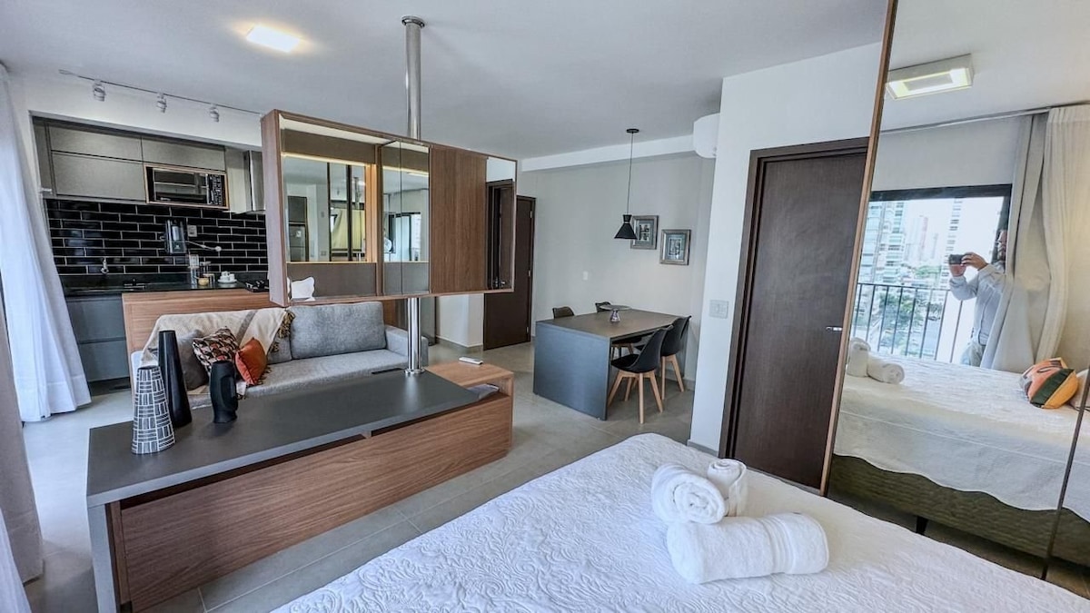 ❗️Un nuevo🤩 condominio único, elegante y sofisticado, hecho para que te sientas como en casa. Mira tu película favorita en el dormitorio o la sala de estar en el televisor inteligente giratorio más moderno con aire acondicionado, mesa de comedor y espacio de trabajo. ¡Descansa en la mejor cama, deleita con la ducha más deliciosa, disfruta del balcón y de una hermosa puesta de sol con vistas al parque y disfruta del contemporáneo Setor Bueno en la mejor región de Goiânia ! Condomínio Tai Residências