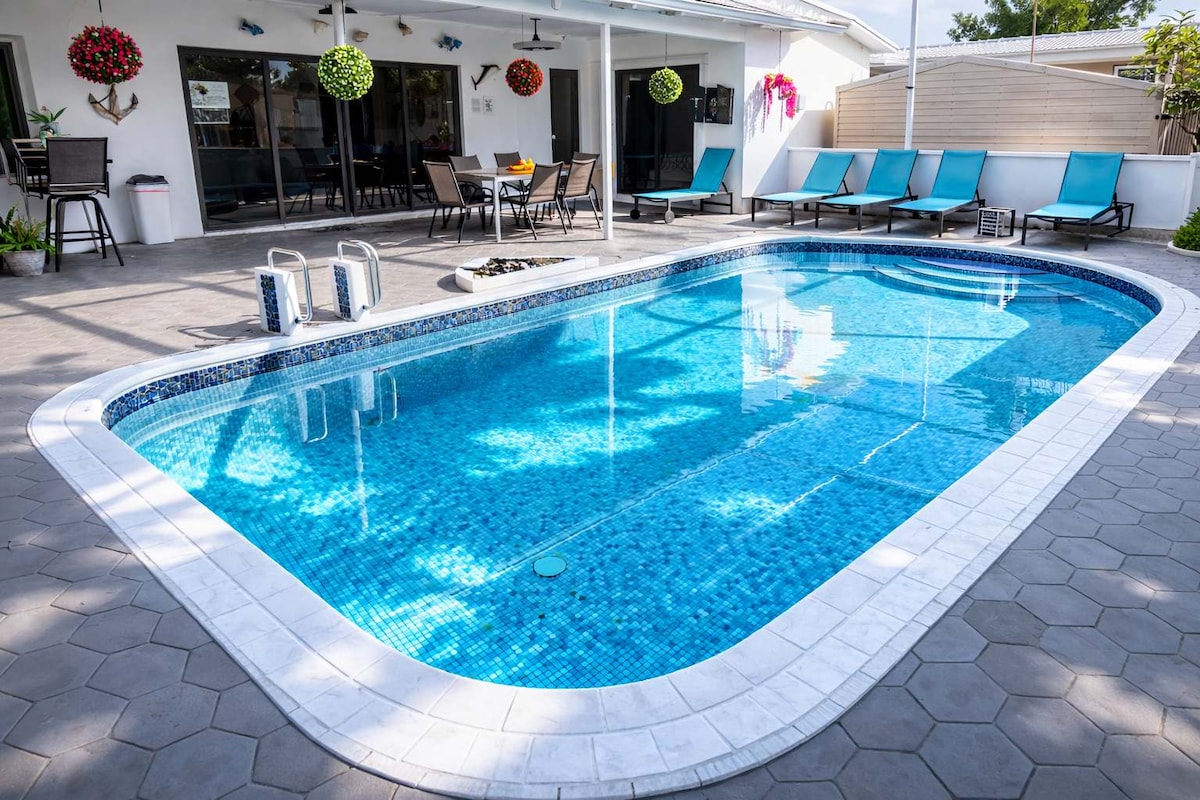 ¡El paraíso te espera! Hermosa casa con piscina mejorada en la soleada Pompano Beach. 4 dormitorios y 2 baños para que puedas repartirte. También tenemos 2 parques de juegos para los bebés. 3 televisores con TV Now. Cocina del chef con cuchillos de acero inoxidable, granito y Henkel. Piscina climatizada con solárium y sombrilla para disfrutar durante todo el año, gran patio cubierto con parrilla y TV. Mucho estacionamiento. Ubicado aproximadamente a 3 millas de la playa de Pompano o Deerfield.