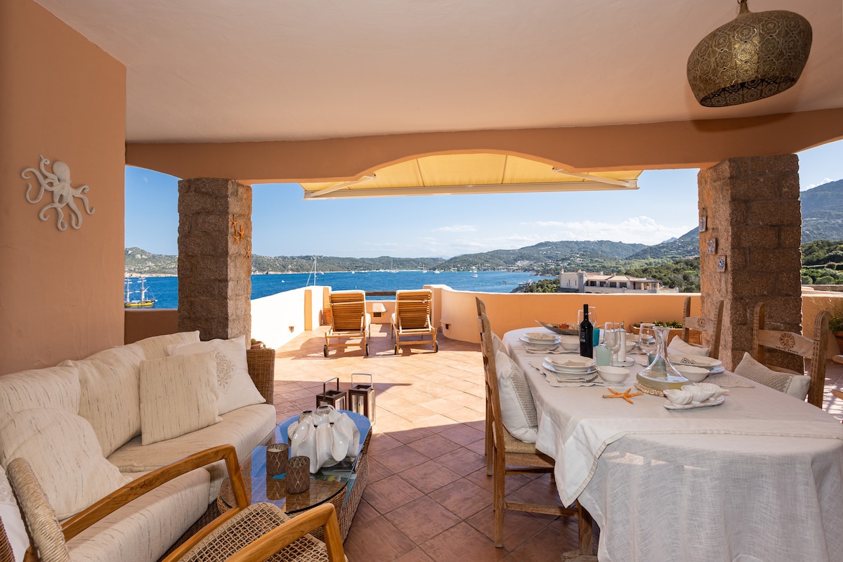 Dentro del famoso complejo Cala Romantica de Porto Cervo, gran apartamento con terraza con vistas al mar, playa privada con muelle para atracar, piscina con agua de mar. Los dormitorios tienen su propio baño con ducha, la gran terraza con vistas al golfo está amueblada y sombreada, una ducha al aire libre, wifi y canales vía satélite. Muy apto para familias. Estacionamiento privado. A 10 minutos a pie del centro de la ciudad.