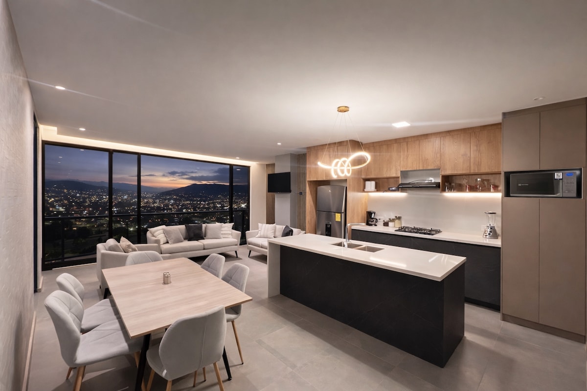 Moderno, elegante y con vistas impresionantes Disfruta una experiencia única en nuestro alojamiento totalmente equipado, ideal para familias, parejas o viajeros que buscan confort y estilo. Este espacio moderno ofrece una decoración sofisticada, gran vista a la ciudad, y todas las comodidades que necesitas para sentirte en casa. Cocina completa, áreas comunes acogedoras y detalles pensados para tu descanso. Perfecto para quienes valoran el buen diseño, funcionalidad y una ubicación privilegiada.