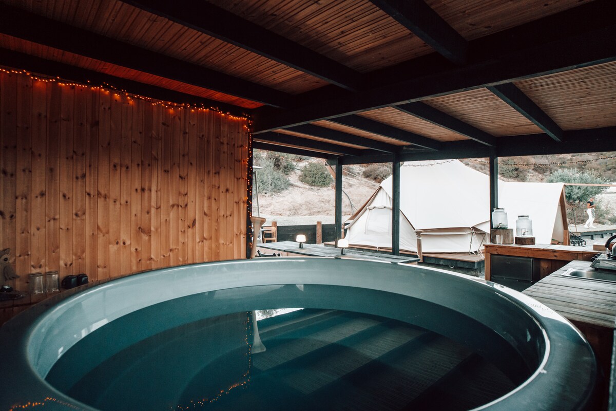 Para glamping de descanso: tienda de campaña Fat Owl con jacuzzi