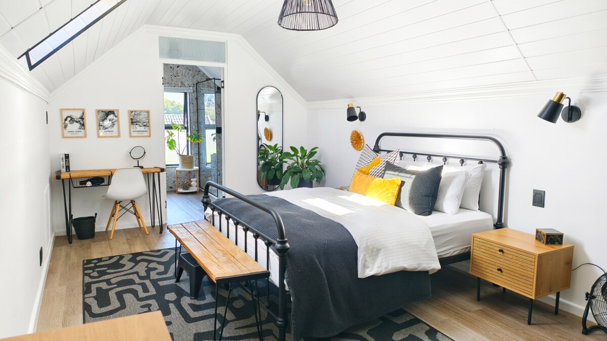 0pen-plan loft blending modern comfort. Cozy queen-size bed, a comfy lounge area, and a balcony with city and garden views — ideal for morning coffee or evening sundowners. Less than a 2 minute drive from the airport. Safe & secure parking space inside the complex. Lockbox entry into the complex make for a smooth arrival anytime. Modern amenities — fast Wi-Fi (battery-backed), great lighting, smart living area with TV, and thoughtful touches to make your stay seamless. 2 min walk to local Spar.