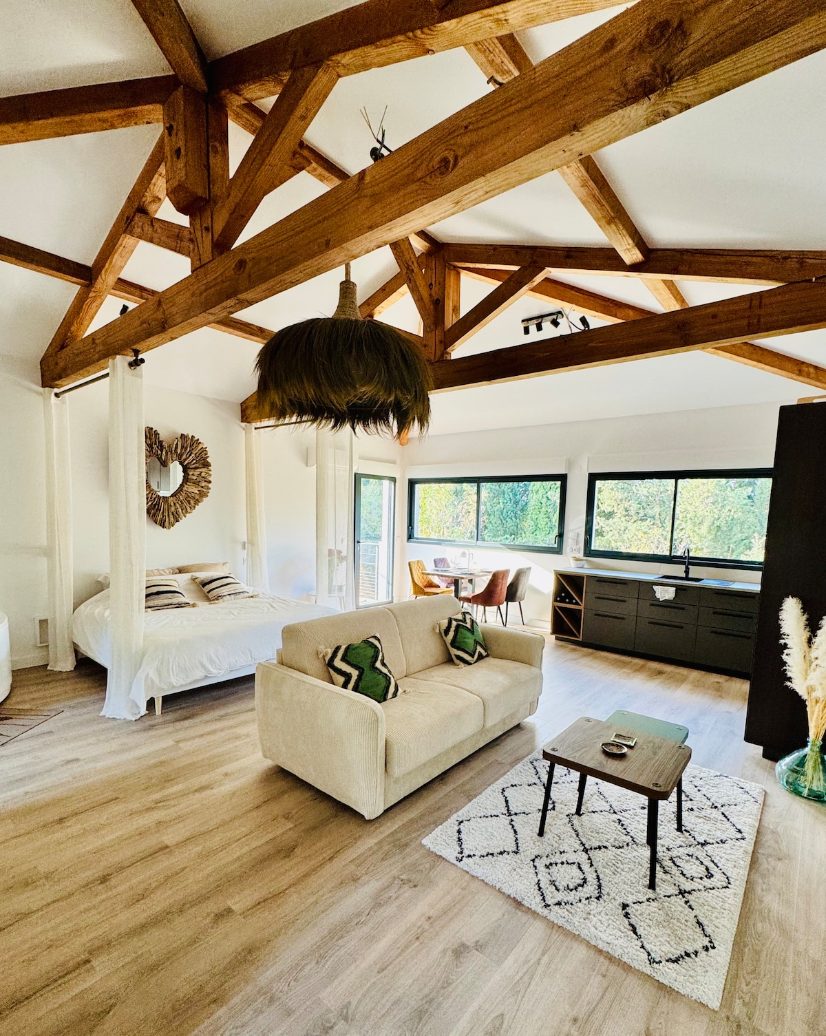 Entièrement rénové, ce loft moderne est composé de 2 chambres, une avec un lit double en 180 et l'autre avec 2 lits simples. Une grande cuisine entière équipée ouverte sur le salon avec cheminée et donnant sur une grande terrasse privative close et sans vis à vis. Vous pourrez profiter de l'espace piscine qui comprend une grande piscine mais aussi une pataugeoire pour les plus petits, d'une cuisine d'été avec bbq au gaz et brasero Nous sommes situés à la campagne et un véhicule est nécessaire.