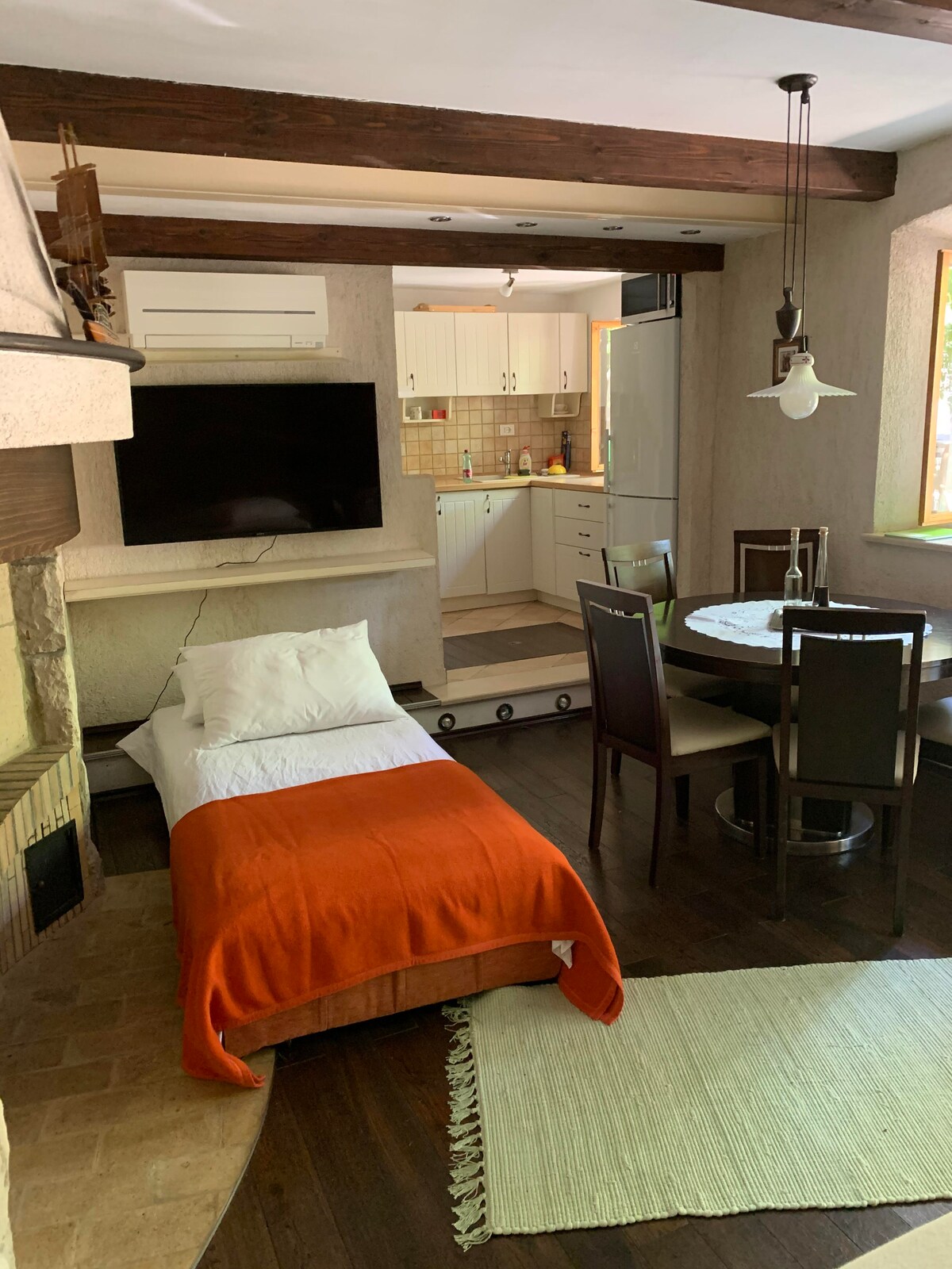 Disfruta de la mezcla única de lo antiguo y lo nuevo; las gruesas paredes de piedra, la chimenea abierta y la iluminación ajustable crearán un ambiente especial. También hay una cocina totalmente equipada y un baño con bañera y una gran terraza delante del apartamento.
