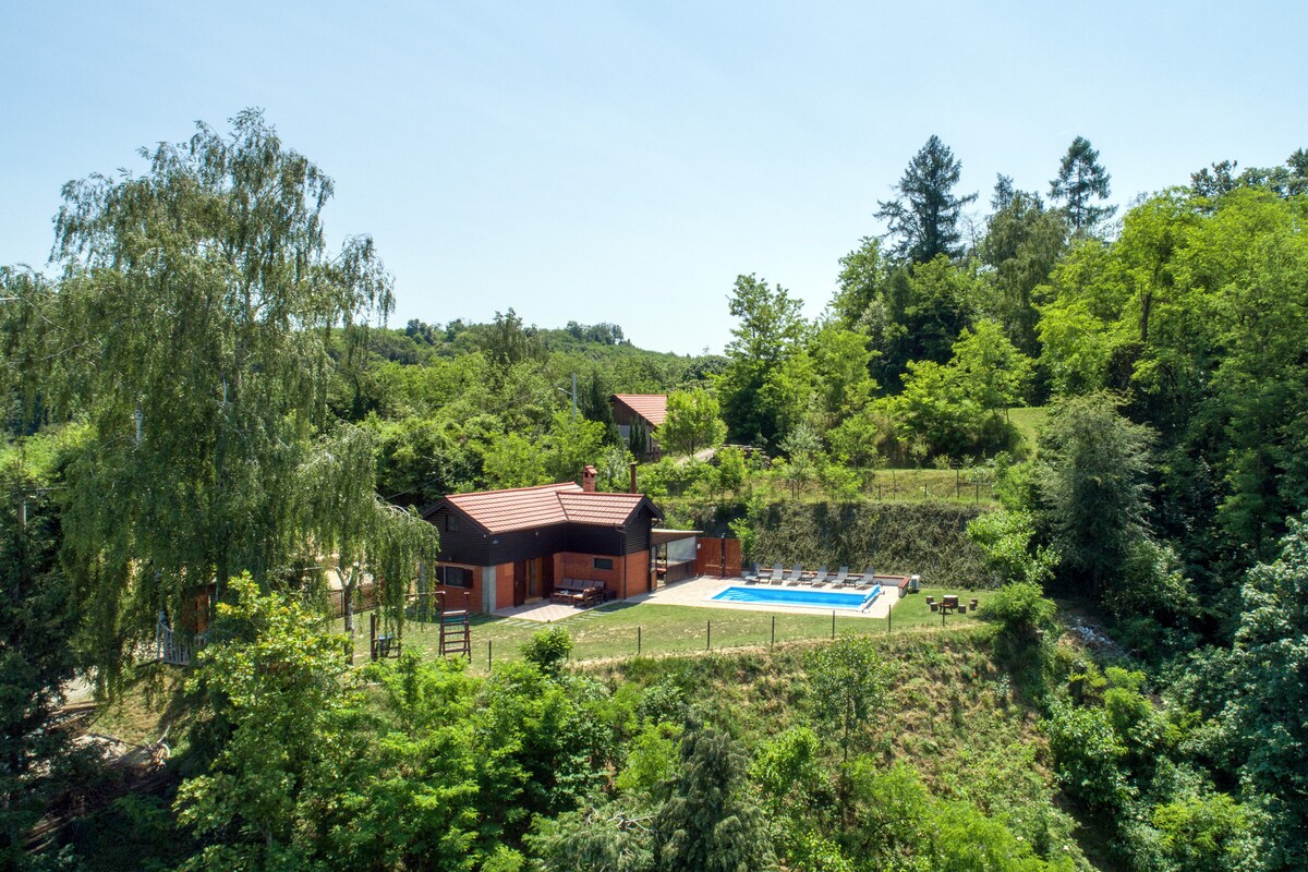 Escape to a private home with pool and sauna, secluded above Koprivnica – created for couples and families. Peaceful hillside retreat with pool and sauna A private hideaway above Koprivnica, perfect for relaxing in nature with stunning panoramic views. Secluded, yet just minutes from the town. Enjoy a large heated outdoor saltwater pool (3.5 × 7 m) or unwind in the Finnish sauna. Children will love the spacious yard with a treehouse, swings, and plenty of space to run and play.