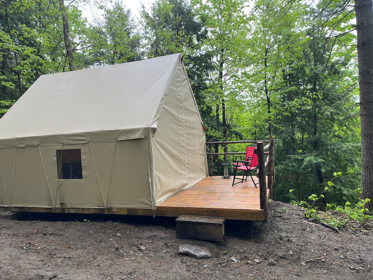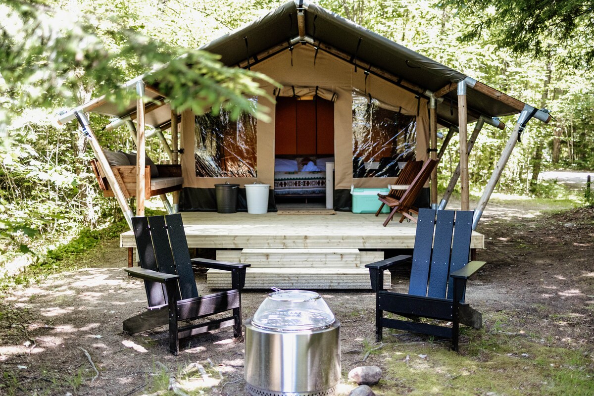 Disfruta de los sonidos de la naturaleza cuando te hospedes en este lugar único. Nuestra tienda de glamping viene equipada con una cómoda cama completa y una cama doble, además de todas las sábanas. Perfecto para estadías con amigos o familiares. Tu propio lugar privado con una parrilla de carbón y un fogón. Dirígete al espacio común de Basecamp Lodge para huéspedes. Allí ofrecemos 2 baños, cocina completa, TV, wifi, espacio de trabajo, una tienda de regalos para explorar nuestras tablas de cortar hechas a medida, camisetas, ¡además de increíble jarabe de arce! Trae tus zapatos de senderismo y explora nuestros senderos :)
