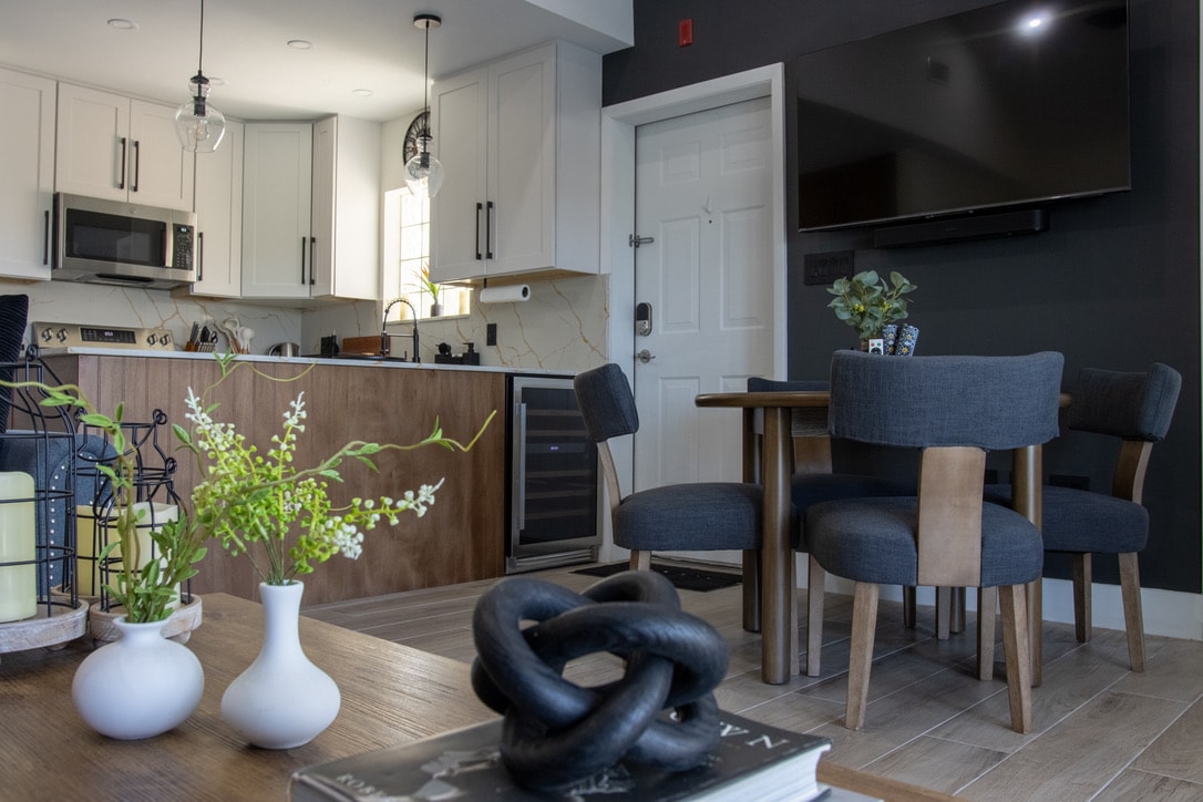 Heavenly Suite #1 en The M es una unidad de 1 dormitorio con una elegante sala de estar/comedor diseñada con elegantes muebles, sofá cama de cuero, televisores inteligentes de alta definición, lámparas de araña, cocina de última generación, encimeras de cuarzo, grifo táctil Delta y triturador de basura. El elegante dormitorio, decorado con azulejos blancos nítidos y candelabros de cristal, imita el lujoso baño decorado con porcelana y azulejos de Carrera, grifos Delta, espejos y apliques. El patio está animado con detalles en verde azulado y blanco, vegetación, bar, pérgolas y jacuzzi.