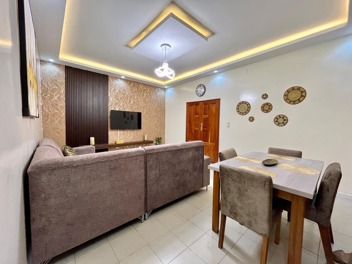 Apartamento tranquilo y suntuoso situado en una villa dentro de una ciudad residencial con una zona verde privada y un sistema de vigilancia colectiva para garantizar un entorno de vida a todos los residentes. Es perfecto y elegante para grupos. El acceso al apartamento es fácil desde la VDN. Está cerca de todos los servicios en la parte residencial, gestionada por un Sindicato de condominios y no muy lejos de restaurantes y supermercados en la parte comercial.