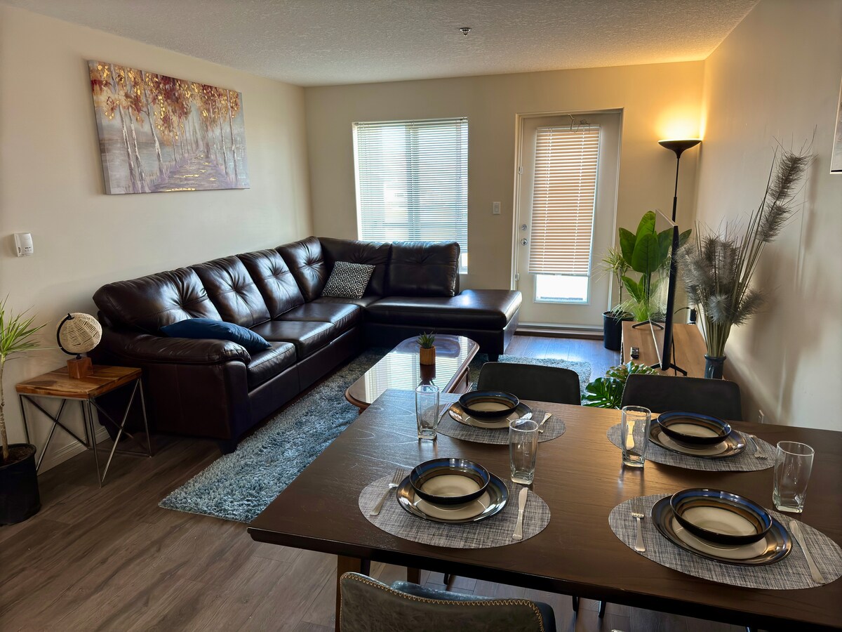 Todo el condominio privado de 2 dormitorios, 1 baño espacioso pero económico, alojamiento AirBnB en el lado oeste de Grande Prairie. Aire acondicionado portátil. Condominio privado y tranquilo en esquina con 2 cómodas camas tamaño queen (colchones nuevos de espuma viscoelástica, medianos). NO se puede COMPARTIR ningún tipo. La ubicación más céntrica del GP con balcón con barbacoa en la zona de Westgate, Grande Prairie. A poca distancia a pie del hospital GPRH, Cineplex, Casino, GPRC College, parques cercanos,tiendas y restaurantes. 1 TV Roku con Netflix en la sala de estar.
