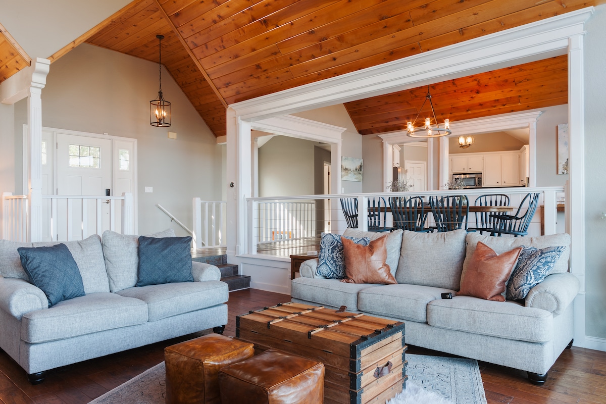 Cerca de restaurantes, actividades para familias, barrio tranquilo y gran espacio al aire libre, bueno para parejas, aventureros solitarios, viajeros de negocios, familias (con hijos) y grupos grandes. Suite principal con cama tamaño king y baño propio. Dos dormitorios con camas tamaño queen (uno de estos tiene una litera doble) y baño en el pasillo, un sótano con literas de tamaño completo, sofá convertible, baño y lavandería, cocina/sala de estar con vistas a dos pisos, totalmente amueblado, TV por cable e internet de alta velocidad, carga de vehículos eléctricos.